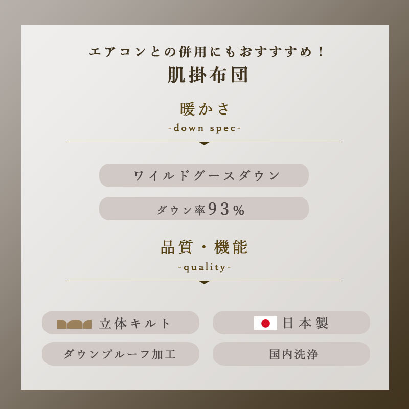 究極の羽毛「アイダーダウン」と同じ野生で育ったグースの羽毛を 使用した羽毛肌掛け布団。野生育ちの強さを持つ。羽毛の暖かさの 目安となる「ダウンパワー」は400以上。羽毛布団の中でも薄手 の肌掛け布団は、軽やかな掛け心地で、夏でも使いやすく寝冷え対 策にも最適。熟練の職人が一枚一枚丁寧に仕上げました。