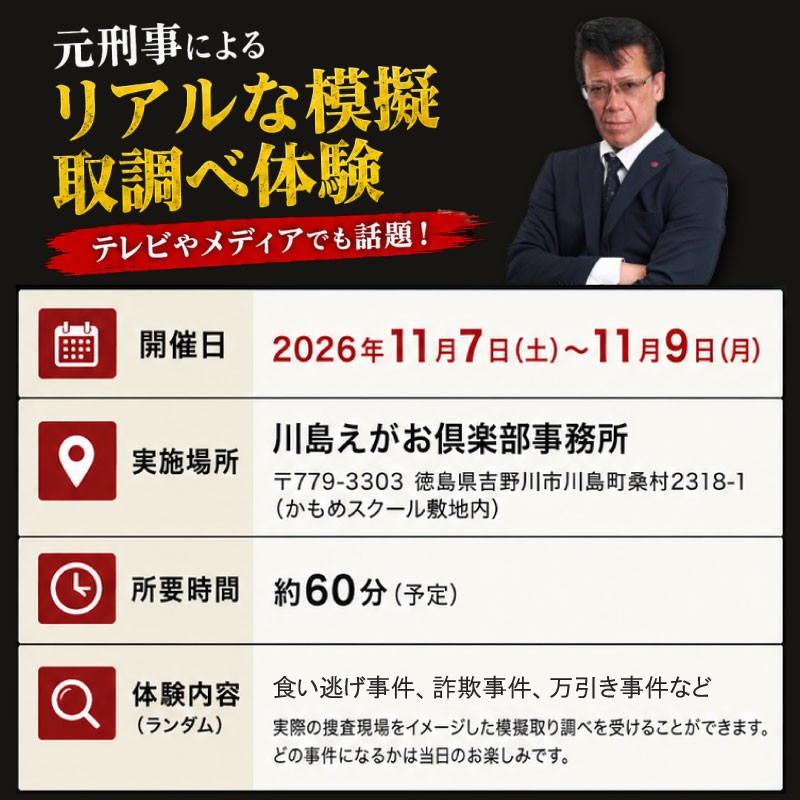 元刑事の“本気”に、あなたは耐えられるか!! 体験型 取り調べ体験 リーゼント刑事 チケット 旅行 徳島県 体験型イベント 元刑事 秋山博康 模擬取調べ リアル体験 記念撮影 サイン色紙 非日常体験 人気