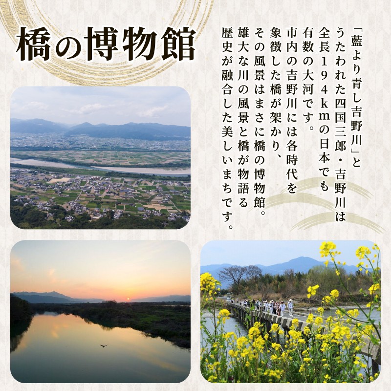 「藍より青し吉野川」とうたわれた、全長194kmの吉野川。市内には沈下橋など、各時代を象徴した橋が架かり、その風景は橋の博物館ともいえます。