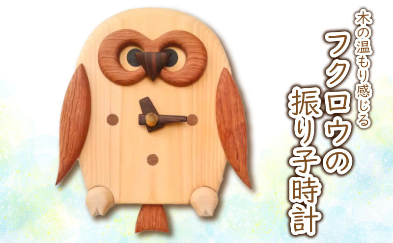 主な材質:本体 ヒノキ 目・くちばし コクタン メガネ・翼・振子 ブビンガ 文字符 マホガニー 秒針 どんぐり(本物を加工して使用しています。)