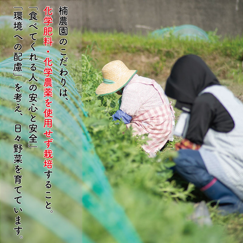 楠農園のこだわりは、栽培期間中化学肥料・化学農薬を使用せず栽培することです。
