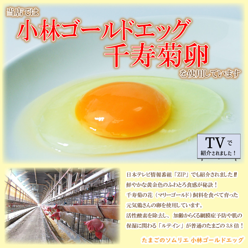 素材にこだわる当店はメディアでも取り上げられている小林ゴールドエッグさんの栄養満点の卵(千寿菊卵)を使用しております。