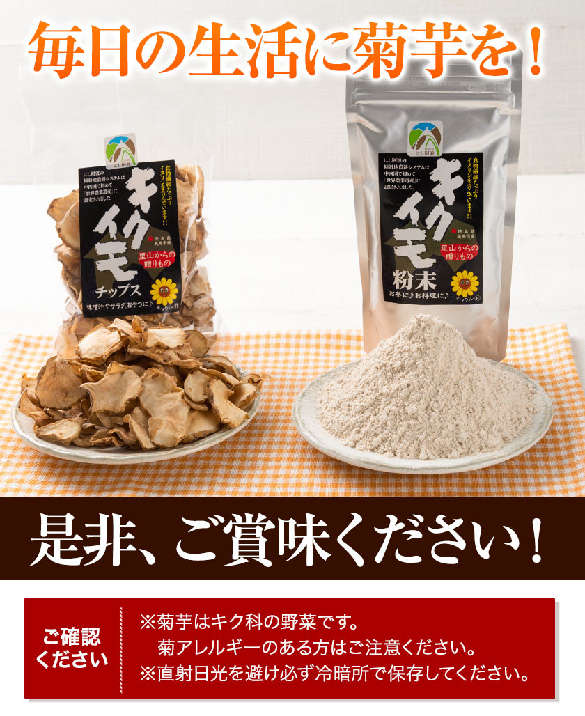 | 容量 | ・キクイモチップス50g×2袋 ・キクイモ粉末100g×2袋 |