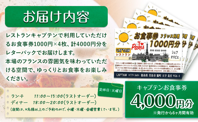 この自治体のポイントについてチョイス公式ポイント交換対象 本場の味を伝えるフレンチレストランで贅沢な時間を フレンチレストラン お食事券 CAP’TAIN 4000円分《30日以内に出荷予定(土日祝除く)》ふるさと納税 徳島県 美馬市 フレンチ キャプテン 食事券 チケット 送料無料 st-p