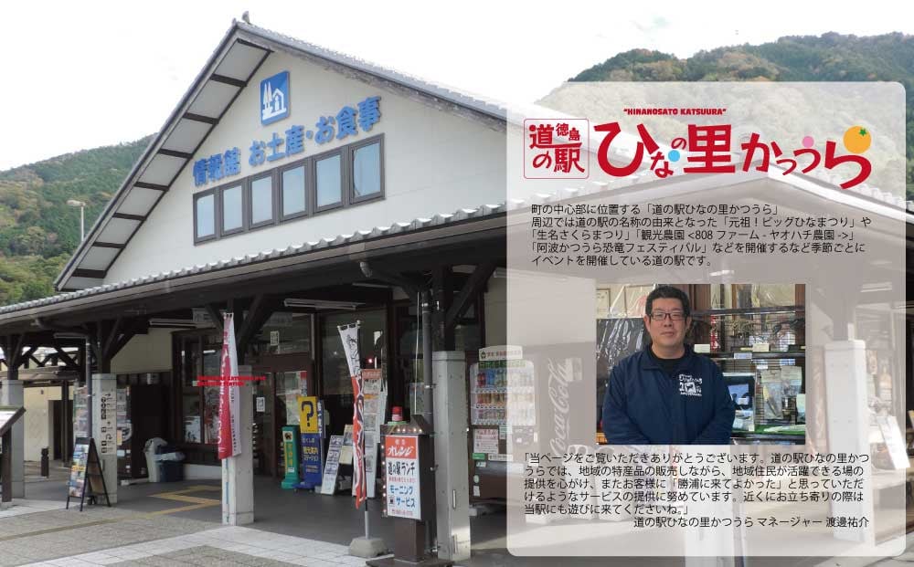 勝浦町は、徳島県の東部に位置し、四方を山々に囲まれた中山間地で、山の中腹まで広がるみかん畑、平野に広がる田園風景、町の中央を流れる清流勝浦川等、自然景観が美しい町です。