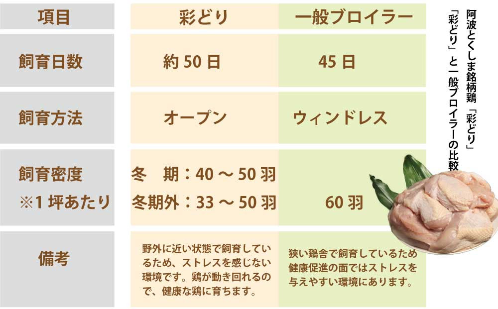 彩どりは、徳島名産のすだち粉末・鳴門わかめパウダーをはじめ、生薬であるかぼちゃ種子・オオバコ・スイカズラ・ベニバナなどを独自配合。エサにこだわり飼育しています。また、ストレスの少ない環境でのびのびと育てることで、低脂肪ですっきりした味わいの鶏に仕上げています。