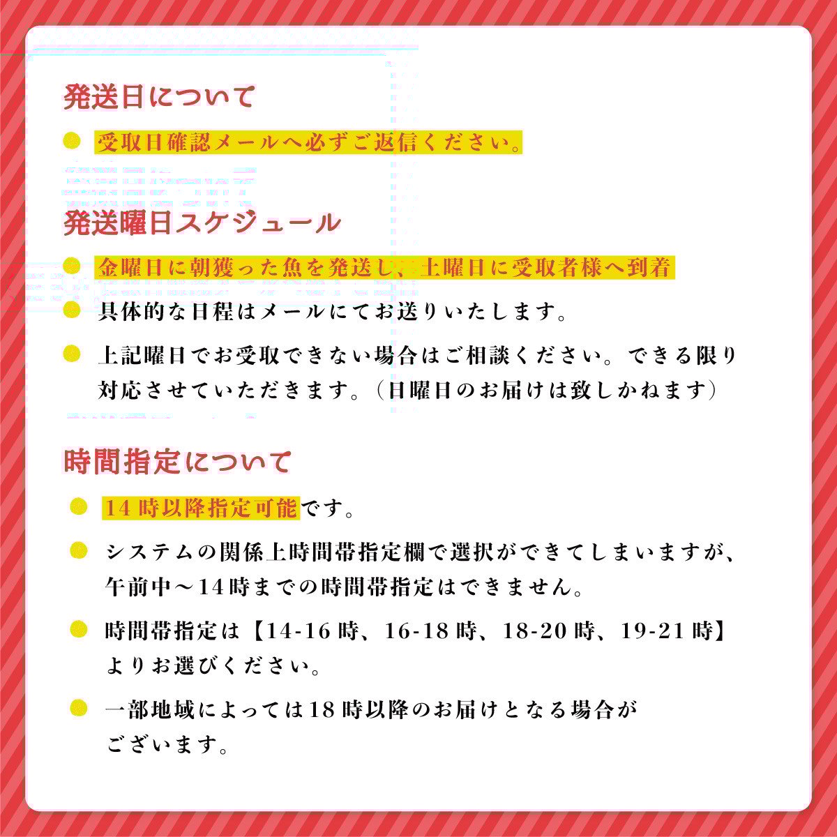 11月以降順次発送 発送曜日スケジュールは以下の通りです。 金曜日:朝獲った魚を発送 土曜日:受取者様へ到着 ※北海道、東北、沖縄、離島のお届けはできません。予めご了承くださいませ。 ※漁の関係で、指定日配送はお受け出来ませんが、受取日の確認メールを寄付者様にお送りいたします。確認メールに回答がない場合は発送を見送り、確認が取れ次第の発送となりますのでご注意くださいませ。 ※上記曜日でお受取ができない場合、ご相談ください。可能な限り対応させていただきます。(日曜日着は致しかねます。ご了承くださいませ。) ※時間帯指定につきましては14-16時・16-18時・18-20時・19-21時よりお選びください。(午前中を含む14時以前のご指定はできかねます。ご了承くださいませ。) ※天候不順、予期せぬ不漁等により、発送が遅延する場合がございます。その際には到着予定日の前日にメールでご案内をいたしますので、必ずメールをご確認ください。 ※生鮮品につき、いかなる理由でも返品・再配達はいたしかねます。ご了承下さい。 |