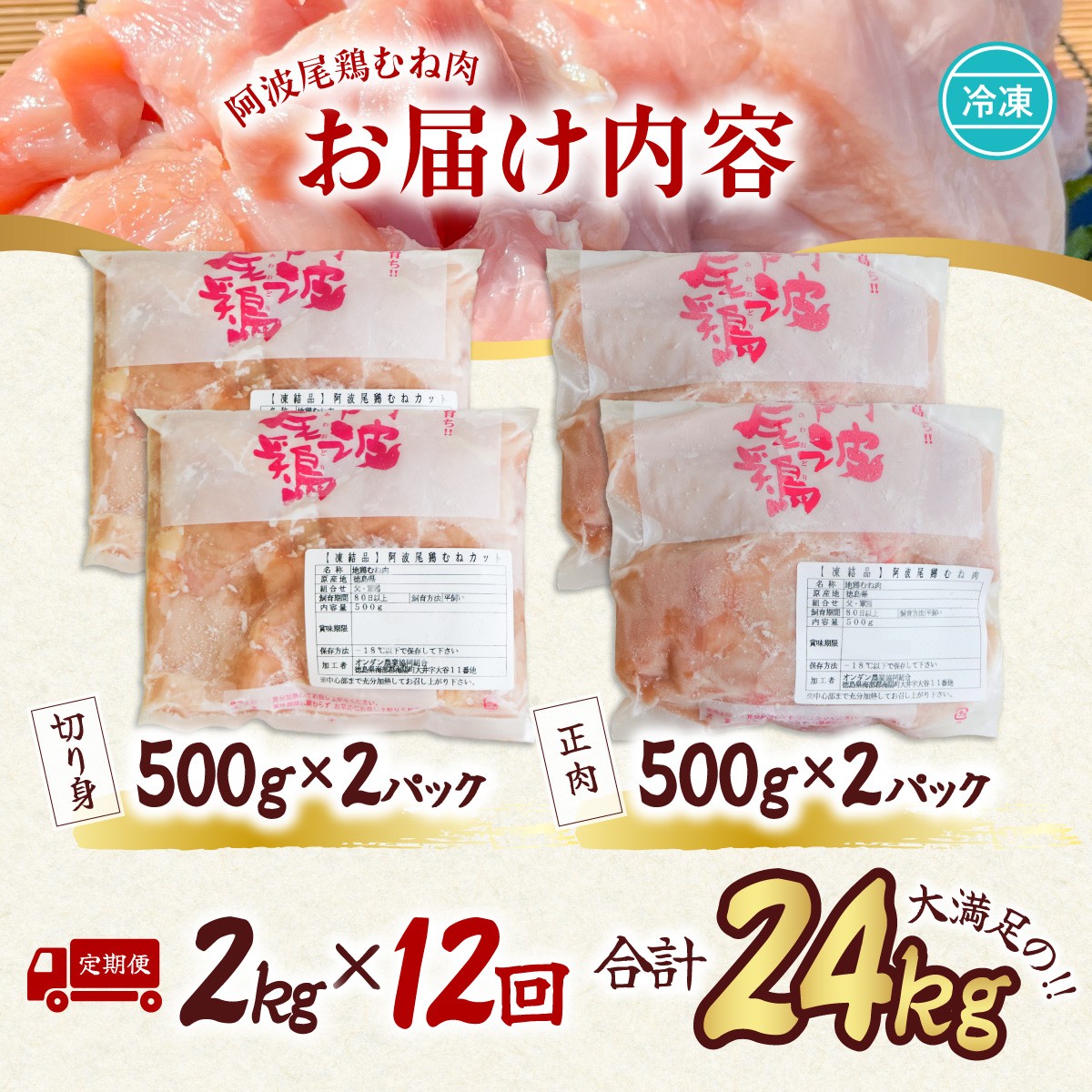 生産量日本一の地鶏「阿波尾鶏」を定期便でお届けします! 【阿波尾鶏のお肉定期便 12か月連続】阿波尾鶏むね肉2kg 12回お届け 12ヶ月定期便 阿波尾鶏 むね肉 約24kg (約2kg×12回) 冷凍 切り身 正肉 セット 徳島 地鶏 あわおどり