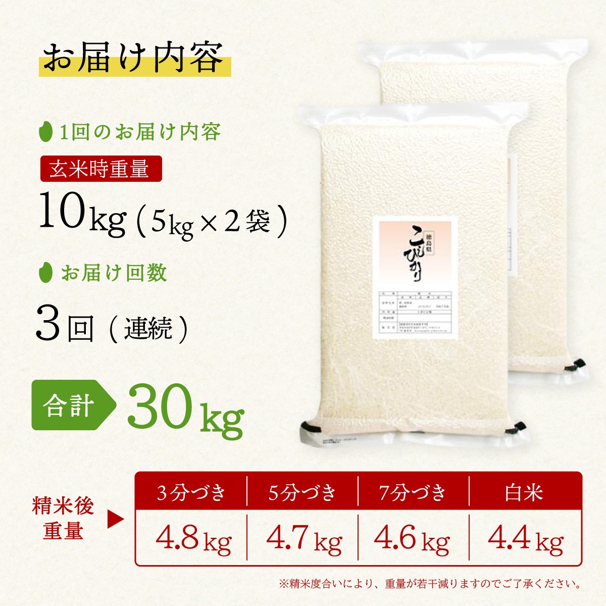 こしひかり 玄米時重量 5kg×2袋×3回 3ヶ月連続 定期便 玄米時重量30kg 分づき米 対応可 真空パック コシヒカリ 米 簡易梱包 エコ梱包