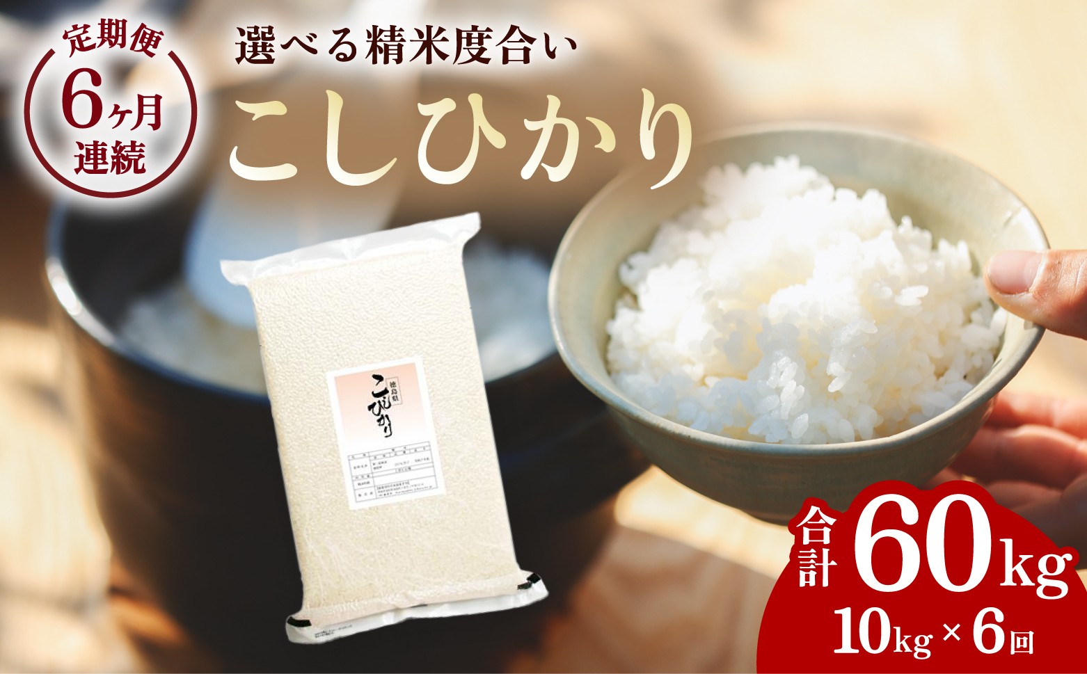 | 容量 | コシヒカリ 玄米時重量5kg×2袋×6回(徳島県産/令和6年産/単一原料米) --- 【ご注意】 精米度合いにより重量が変わります。 備考欄にお好みの精米度合いをご記入ください。(2袋それぞれ選択可) 備考欄への記載がない場合は「白米(精米後4.4kg)×2袋」でのお届けとなります。 ・白米(精米後4.4kg) ・七分づき(精米後4.6kg) ・五分づき(精米後4.7kg) ・三分づき(精米後4.8kg) ・玄米(5kg) --- (例)七分づき1袋と玄米1袋など |