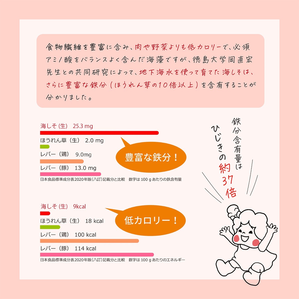 ミネラル豊富な海水で育てられた海藻ラボの"海しそ(あかねそう)"はびっくりするほどの自然の鉄分を含んでいます。
