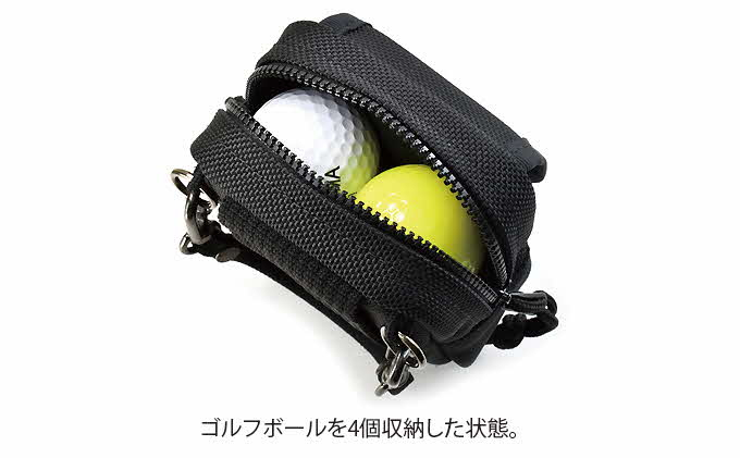 ゴルフボールを4個収納し、フロントにティーなどを入れるポケット付きのファスナータイプのケース。ウエスト周りに吊るしたり付属のバッグ用ストラップで様々な場所に吊るして持ち運びできます。