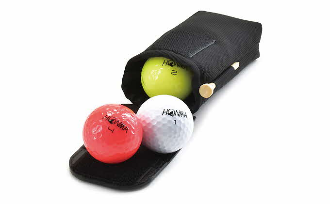 ゴルフボールを縦向きに3個収納できウエスト周りに吊るして持ち運びできるケース。本体両サイドにはティーをさすことができるホルダーが付いています。