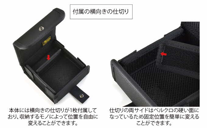 | 容量 | 品番:VE302 本体表素材:バリスティックナイロン(1050デニール)/中芯:セミハード素材:ベルポーレン(厚さ3mm)/本体内部蓋、底部分素材:Wポリメッシュ カラー:ブラック サイズ:外寸:縦(約)135mm×(約)123mm×高さ(約)55mm内寸:縦(約)115mm×横(約)95mm×高さ(約)45mm 付属品:横向きの仕切り:1枚 Made in Japan/日本製  |