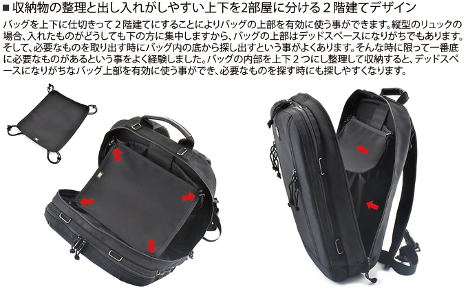 | 容量 | 品番:VE702-M カラー:ブラック 表素材:バリスティックナイロン製(1050デニール) 本体内素材:ナイロン 本体内背面ポケット:Wポリメッシュ 本体サイズ(約):縦400mm×横300mm×襠140mm/メイン収納部の襠幅(約):100mm/フロントポケットの襠幅(約):40mm/付属品:2階建て用アタッチメント、フロントパット、ぬめ側のハンドルカバー(キャメル) Made in Japan/日本製 |