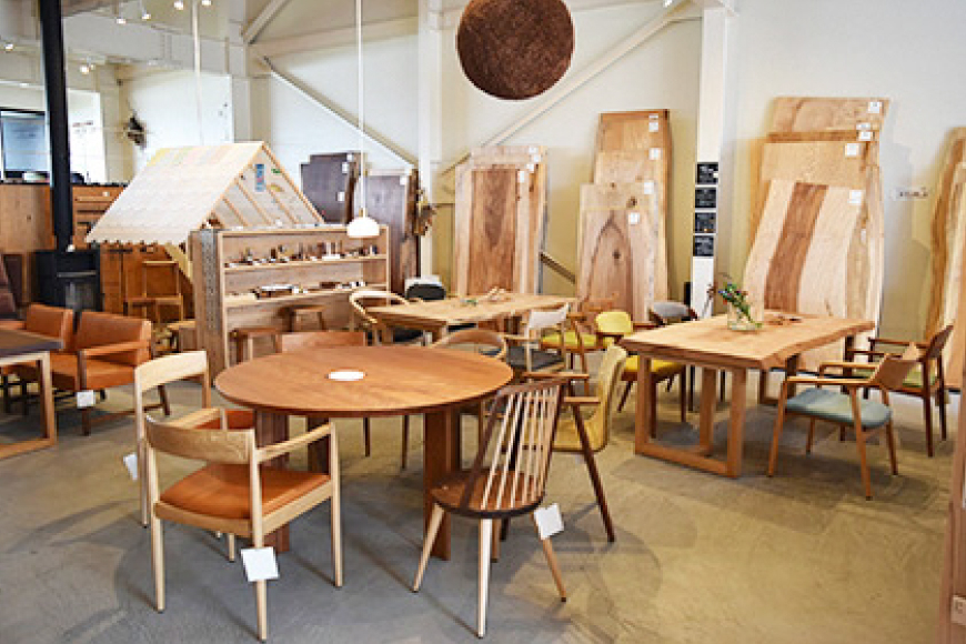 一枚板の豊富な品揃え、デザイナーズチェア、木の小物。
