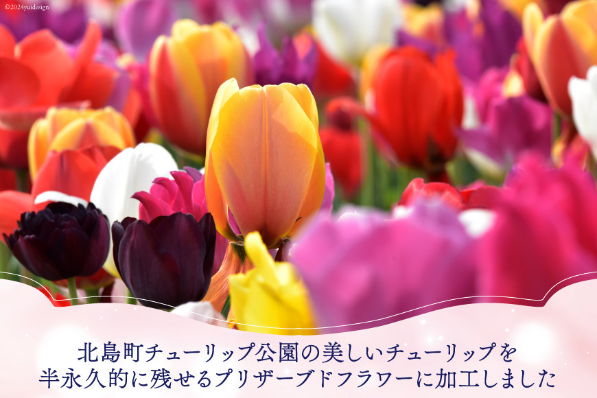 チューリップの花は非常に花弁が薄く、プリザーブドフラワーに加工するには脱水・着色ともに非常に難易度が高く、世界的にみても数が少なく非常に希少価値が高いです。