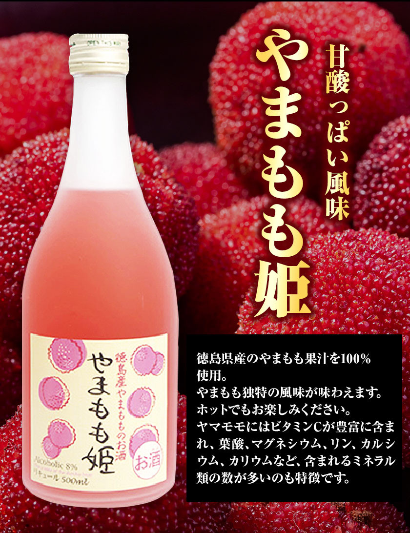 原材料名:すだち果汁(徳島県産)、ゆず果汁(徳島県産)、やまもも果汁(徳島県産)、焼酎甲類(国内製造)、焼酎乙類(国内製造)、糖類 添加物:香料、酸味料、着色料(※やまもも姫のみ)