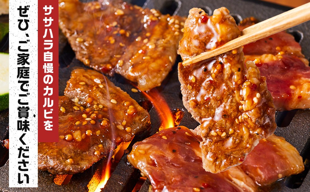 洋梨やリンゴなどの果汁と韓国産の唐辛子を使用した甘口醤油味の焼肉タレに、厚切りのカルビを漬け込みました。 焼肉タレへのこだわり…香りが高く旨味とコクがあるあんどう醤油醸造場のお醤油をベースにした