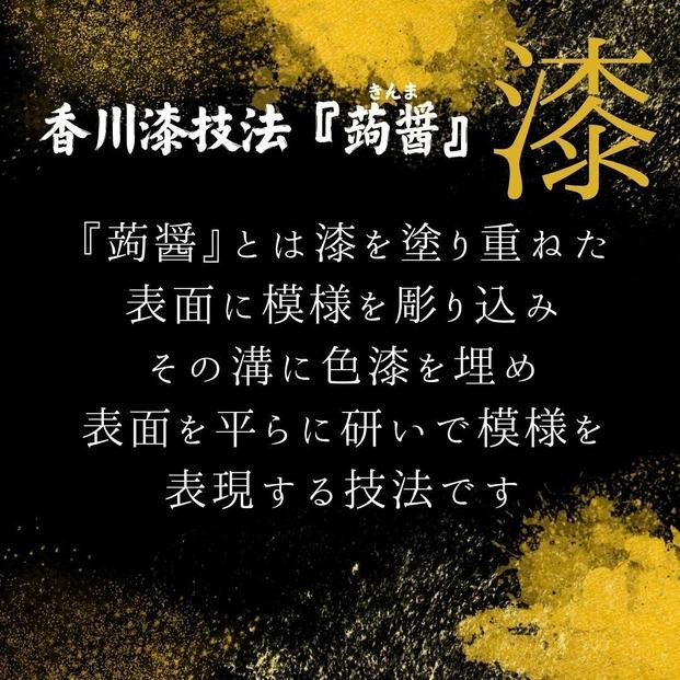 香川漆芸は彫りの技術と多彩で美しい色漆の使用が特徴です。蒟醤(きんま)・存清(ぞんせい)・彫漆(ちょうしつ)・後藤塗り(ごとうぬり)・像谷塗り(ぞうこくぬり)の技法は香川県の伝統的工芸に指定され、古くから伝統を受け継ぐ職人によって守られてきた技法です。