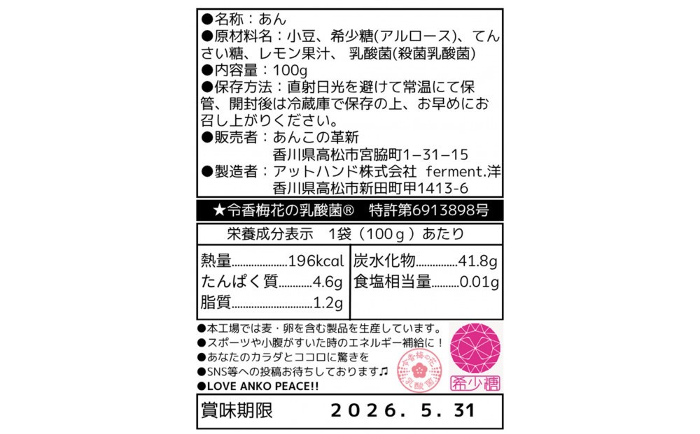 | 容量 | あんこの革新 ・100g×3個入セット ■原材料 小豆(北海道 十勝産)、希少糖(アルロース)、てんさい糖、レモン果汁、乳酸菌(殺菌乳酸菌) |