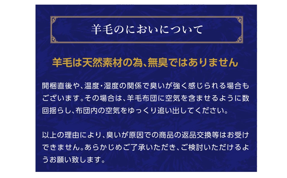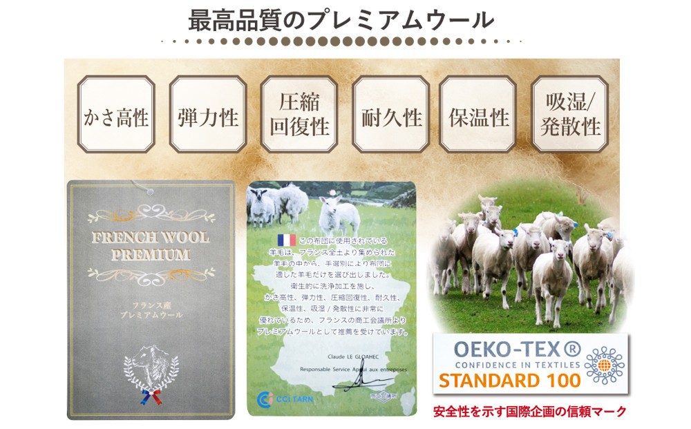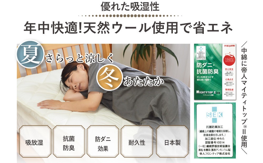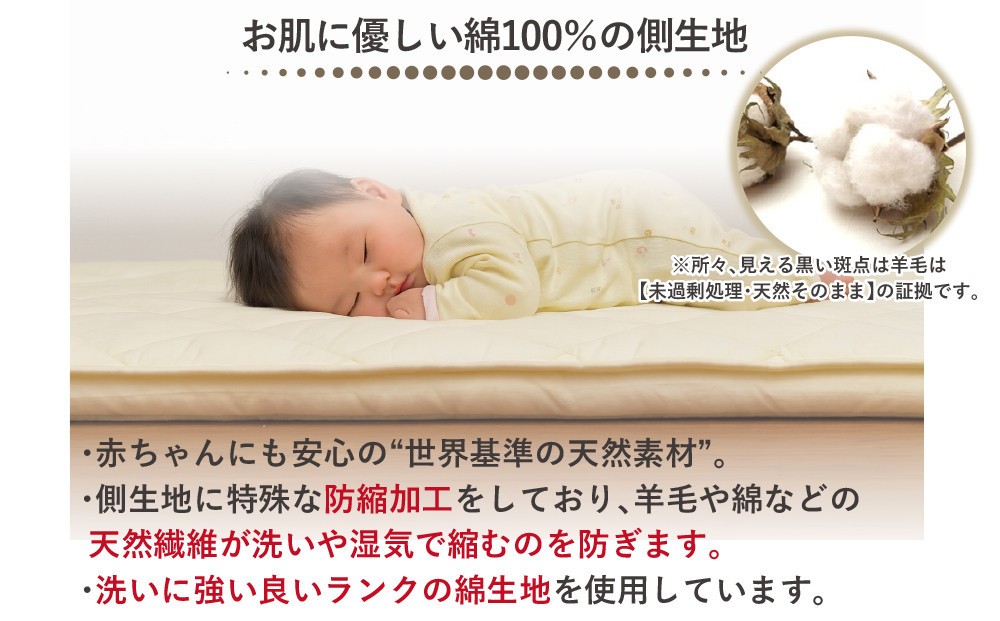 最高品質の「フランス羊毛」と防ダニ消臭効果のある「帝人マイティトップ2」を使用した敷布団。天然ウール使用なので年中快適!!夏はさらっと、冬はあたたか。固綿を2枚使用しているので腰への負担を軽減。また側生地はお肌に優しい綿100%。職人の手で丁寧に作られた敷布団です。