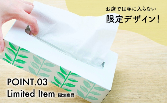 淡いカラーで描かれた植物モチーフを、北欧風にレイアウト。ティッシュカバーなしでもそのまま置ける、おしゃれなデザインです。企業ロゴの表面印字はなく、どんなお部屋にもすっとなじみます。