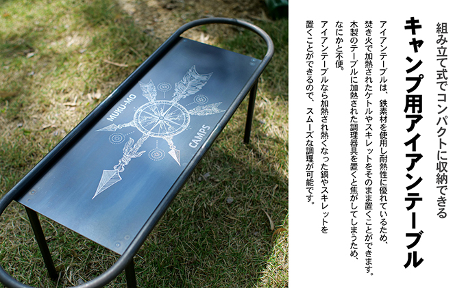 組み立て式でコンパクトに収納できるキャンプ用アイアンテーブル! アイアンでできており、熱に強いため焚き火の近くで使用するのにおすすめです。 天板の周りにはアイアン丸棒のフチが設けられているので、物が落ちづらい構造。 また丸棒にフックやシェラカップを吊るしておくことができるので、物が増えがちなテーブル周りをスタイリッシュに保つことができます。 持ち運びの際も、輪っか部分を持つことができて持ちやすいです。 【スケートボード風デザイン】 アイアンの天板には「MUKUMO CAMPS」ロゴをレーザー彫刻しました。 スケートボードをイメージしたデザインでサイドテーブルにぴったりのサイズ感。 焚き火とともに使用してほしい無骨なテーブルができあがりました。 ※【総務省告示第179号第5条第3号の地場産品基準に該当する理由】 全ての工程を丸亀市内で行っている(設計・鉄を加工しパーツを作る工程・組立・溶接・色付け等) ※画像はイメージです。