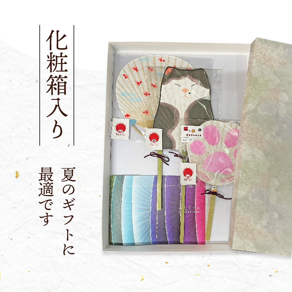 丸亀うちわ伝統工芸士「兵頭恵子」作です。 山から竹を切り出し、竹骨を作り和紙を貼るまで一貫して製作しています。 小ぶりでかわいいうちわの製作を得意としています。 涼猫は、いつも傍らでそっと寄り添ってくれている猫さんをイメージしています。 猫の手借りちゃいますは、扇面が手のひらサイズでカバンの中に入れて持ち歩くのに最適です。 涼は、薄い和紙を扇面に貼り、女性が握りやすいように持ち手を細くしています。 ※画像はイメージです。 ※扇面は、和紙を使用しています。水に濡れないようにご注意ください。 【総務省告示第179号第5条第3号の地場産品基準に該当する理由】:全ての工程を丸亀市内で行っている(竹軸の制作から、和紙はり、箱詰め、発送まで)