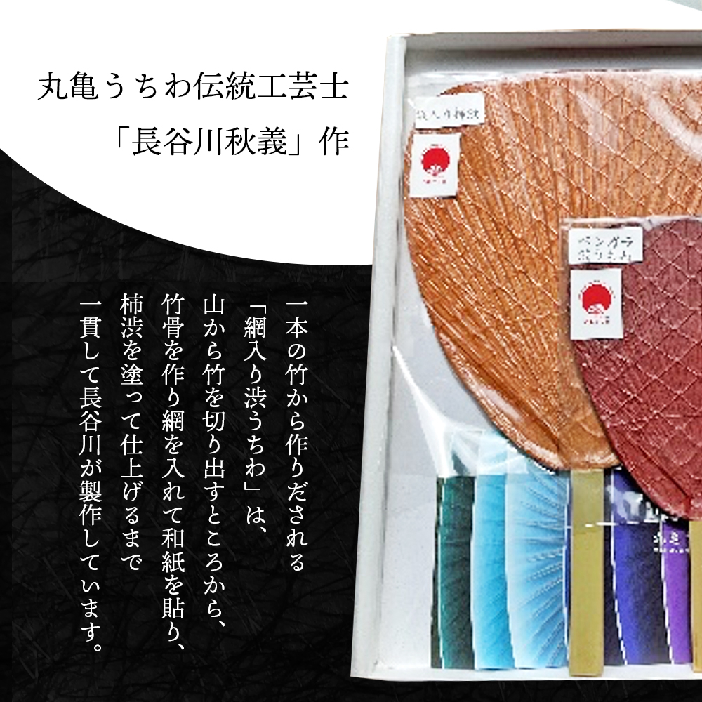 丸亀うちわ伝統工芸士「長谷川秋義」作です。 一本の竹から作りだされる「網入り渋うちわ」は、山から竹を切り出すところから、竹骨を作り網を入れて和紙を貼り、柿渋を塗って仕上げるまで一貫して長谷川が製作しています。 柿渋を塗っているので使い込むほど味わい深くなり、網を入れているので破れにくく、キャンプなどの火おこしにも重宝されています。 ※画像はイメージです。 【総務省告示第179号第5条第3号の地場産品基準に該当する理由】:全ての工程を丸亀市内で行っている(竹軸の制作から、和紙はり、箱詰め、発送まで)