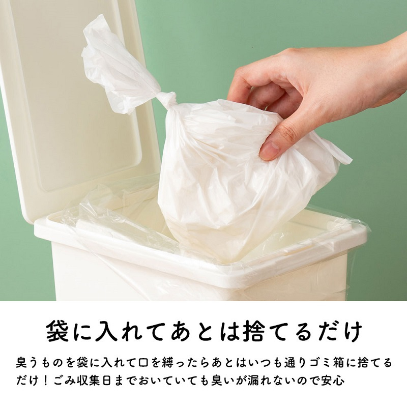 使用方法は袋の口を玉結びで縛るだけ、特殊な処理などは必要なく、簡単に防臭効果が期待できます。
