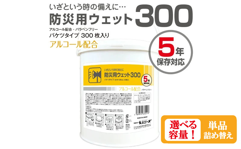 いざという時の備えにたっぷり拭ける大容量 大判300枚! 【防災用ウェット300】【本体・詰替え 選べる容量】バケツタイプ 本体300枚入 アルコール配合・バラベンフリー 日用品 ウェットティッシュ ウェットシート 人気日用品 まとめ買い 消耗品 防災用品 備蓄 備蓄品 防災 防災グッズ