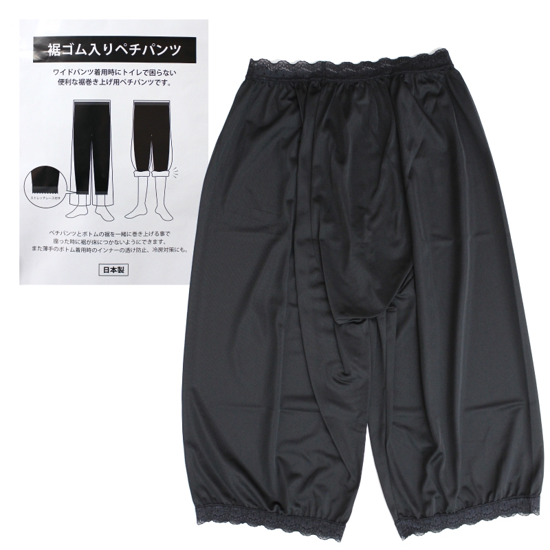 ボトムの裾をペチパンツと一緒に折り返すだけでボトムの裾が落ちにくくなり、お手洗いなどで裾を床につけたくない時にも便利です。重ねばきしてもムレにくく、汗をかいてもサラッと快適。帯電防止加工素材を使用しているので、静電気を防止し、ボトムの張り付きや、まとわり付きを軽減します。 裾ゴム入りペチパンツ 後ろマチ付き ウエストのレースと足口のレース、身生地ともに、日本の素材を使用