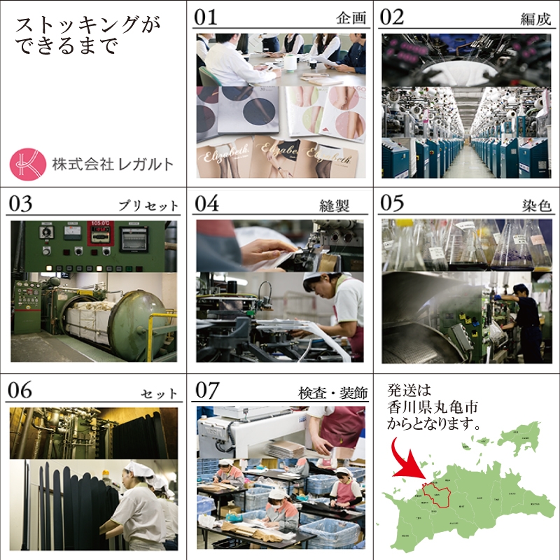 丸亀市内の工場で主要な加工を行っている(1)素材・糸の準備(2)編み立て(3)縫製・染色(必要な場合)(4)仕上げ加工(5)検品・品質チェック(7)梱包・出荷