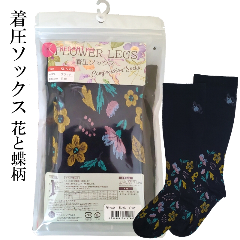 可愛いデザインなのに段階着圧設計を搭載したハイスペックハイソックス 【フラワーレッグスシリーズ】着圧ソックス 花と蝶柄 ブラック・ネイビー・グレー M L 3 L-4 L 5 L-6 L FW-HS04
