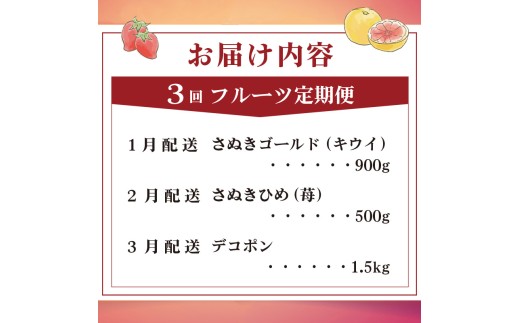 容量 | 1月:さぬきゴールド キウイ 約900g 2月:さぬきひめ 苺 約500g (250g×2パック) 3月:デコポン 約1.5kg 常温/冷蔵配送※果物の状態や気温に合わせて、最適な方法(常温・冷蔵)でお届けします。 |