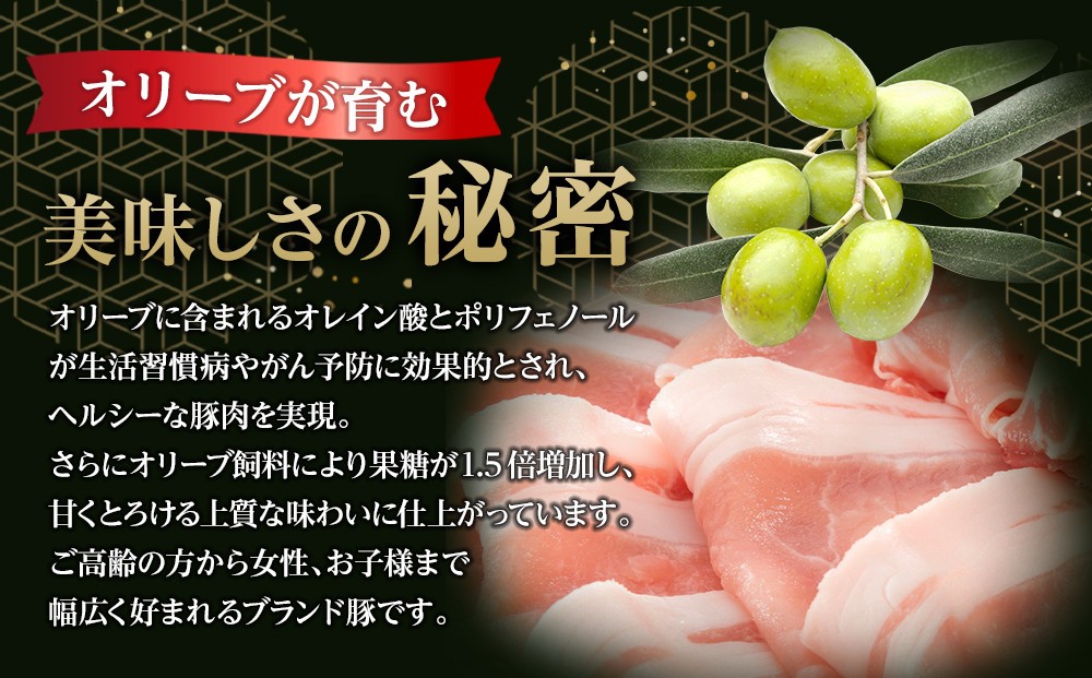 「オリーブ豚」おいしさの証 香川県の県花県木であり、百有余年の歴史を誇るオリーブ絞り果実の飼料を給与することで しっかりした赤身の旨みさっぱりとした脂の甘味の美味しい「オリーブ豚」が誕生しました。 「オリーブ豚」の特徴はしっかりした赤身の旨味。さっぱりとした脂の甘味です。 オリーブには、生活習慣病の予防・改善に良いといわれるオレイン酸や、がんの予防に役立つといわれるポリフェノールなどの抗酸化成分が多く含まれています。このオリーブ採油後の果実を加熱乾燥し、飼料として与えると、肉質が変化して、口の中で甘くとろけ、あっさりした味わいに。オリーブ飼料を給与することで、旨味・甘味成分が高まることが確認され、なかでも、フルーティーな甘味が特徴の果糖(フルクトース)が、与えていない場合より約1.5倍高いことがわかりました。 香川県の銘柄豚を代表する「オリーブ豚」ぜひともご賞味ください。 ※離島への配送はできません。予めご了承くださいませ。 ◆お礼の品お問合せ先◆坂出食肉事業協同組合(TEL:0877-46-3529) 関連キーワード:香川県 坂出市 香川 四国 ふるさと 納税 返礼品 支援 お取り寄せグルメ 取り寄せ グルメ 食品 豚肉 豚 肉 お肉 ぶた ブタ 豚ロース スライス ロース お取り寄せ おいしい 美味しい 特産品 ご当地