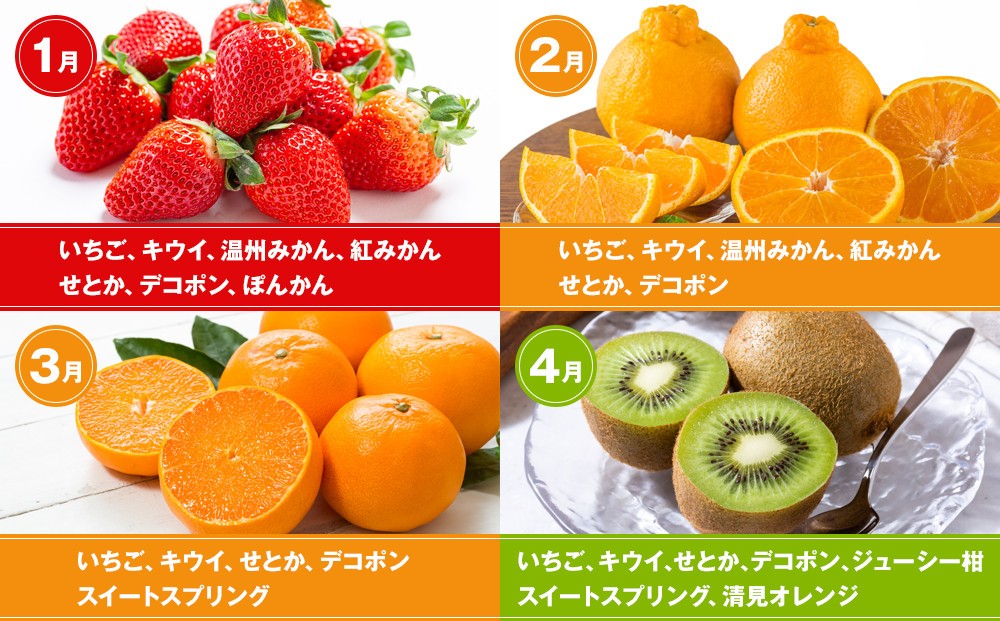 | 容量 | 今のおいしい!3~5品種の厳選フルーツを月1回6か月連続でお届けいたします。 ■各月の詰合せ内容物の目安 【重要】 下記の内容は、前年度までの弊社入荷実績・発送実績からの算出であり、あくまで目安となります。 天候や入荷状況により記載内容の果物が入る場合、記載内容の果物が入らない場合および記載内容以外の果物が入る場合もございます。 また、内容のご指定はいただけませんので、予めご了承くださいませ。 (1月)いちご、キウイ、温州みかん、紅みかん、せとか、デコポン、ぽんかん (2月)いちご、キウイ、温州みかん、紅みかん、せとか、デコポン (3月)いちご、キウイ、せとか、デコポン、スイートスプリング (4月)いちご、キウイ、せとか、デコポン、スイートスプリング、ジューシー柑、清見オレンジ (5月)いちご、キウイ、デコポン、はっさく、ジューシー柑、清見オレンジ、甘夏柑 (6月)キウイ、びわ、デラウェア葡萄、桃、すもも、ジューシー柑、甘夏柑 (7月)デラウェア葡萄、すもも、桃、梨、黒ぶどう、ジューシー柑 (8月)デラウェア葡萄、桃、梨、黒ぶどう、マスカット (9月)桃、梨、黒ぶどう、マスカット (10月)梨、黒ぶどう、マスカット、キウイ、柿、極早生みかん (11月)黒ぶどう、キウイ、柿、温州みかん、紅みかん (12月)いちご、柿、温州みかん、紅みかん、キウイ ■おすすめの食べ方・内容紹介 お届け時に各品種の詳細が分かる「お品書き」を同封しております。 ぜひご参照のうえ旬果実をお楽しみくださいませ。 ■保存方法 冷蔵/常温(一部) |