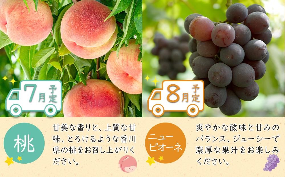 | 容量 | 7月/桃(約2kg/約6-8玉) 8月/ニューピオーネ (約2kg/約3-5房) 9月/シャインマスカット (約2kg/約3-5房) 12月/小原紅早生(約5kg) 1月/さぬき姫いちご(4パック) 2月/せとか&デコポン (各約2.5kg/計約5kg) |