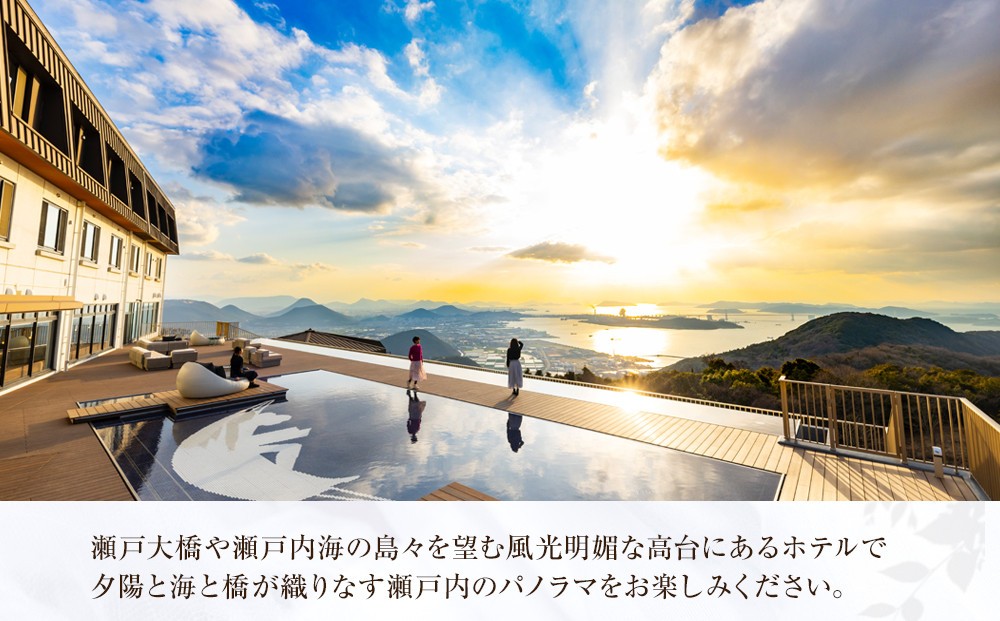 標高400mに建つホテルから瀬戸内海が一望できる絶景の宿。瀬戸大橋や瀬戸の島々を美しく染める夕日は、心が和む風景です。お食事は讃岐うどんはもちろん、オリーブハマチや季節のグルメなど、香川県と瀬戸内の海の幸、大地の恵みの食材をご堪能いただけるグルメビュッフェをご用意。ゆっくりと瀬戸内の夜景を眺めながらお楽しみいただけます。