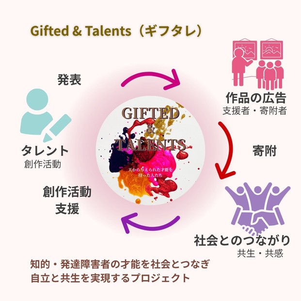 “才能を社会とつなぐ”をテーマに、障がいのある方々が持つ多様な能力=タレントが、創作を通じて社会と関わるプロジェクトです。あなたの寄附や応援が、次の創作と新しい共生のかたちを育みます。