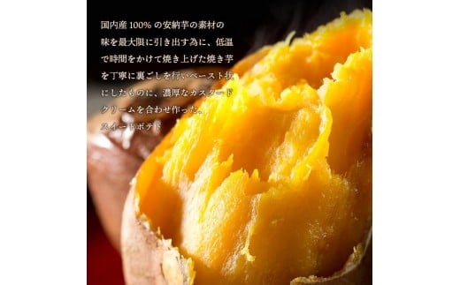 ・国内産100%の安納芋の素材の味を最大限に引き出すために、低温で時間をかけて焼き上げた焼き芋を丁寧に裏ごしを行いペースト状にしたものに、濃厚なカスタードクリームを合わせ作った、スイートポテト