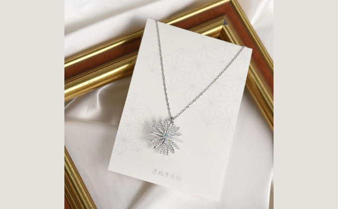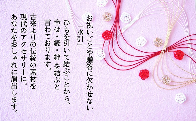 古くから伝わる伝統の素材「水引」を、おしゃれなアクセサリーに仕上げました。とても軽く、表面にあしらったスワロフスキーが胸元を一層輝かせます。