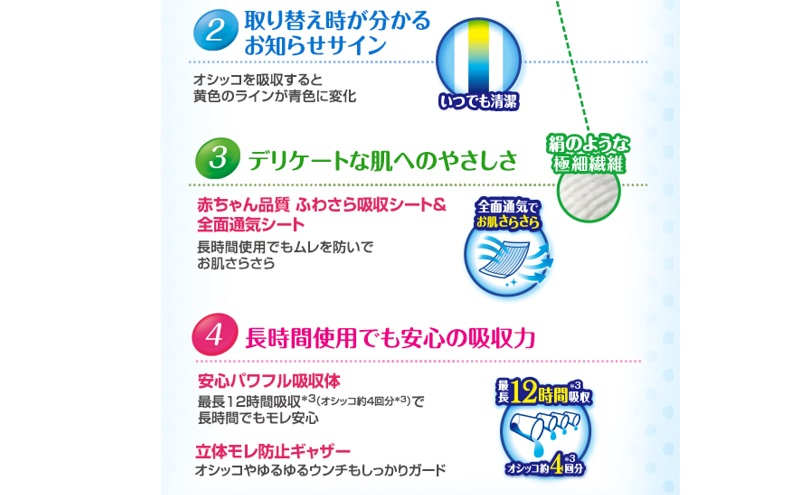 | 容量 | 適応胴周り15~25cm 適応体重:男の子1.5~3.0kg・女の子1.5~3.5kg SSSサイズ36枚×4パック(計144枚) |