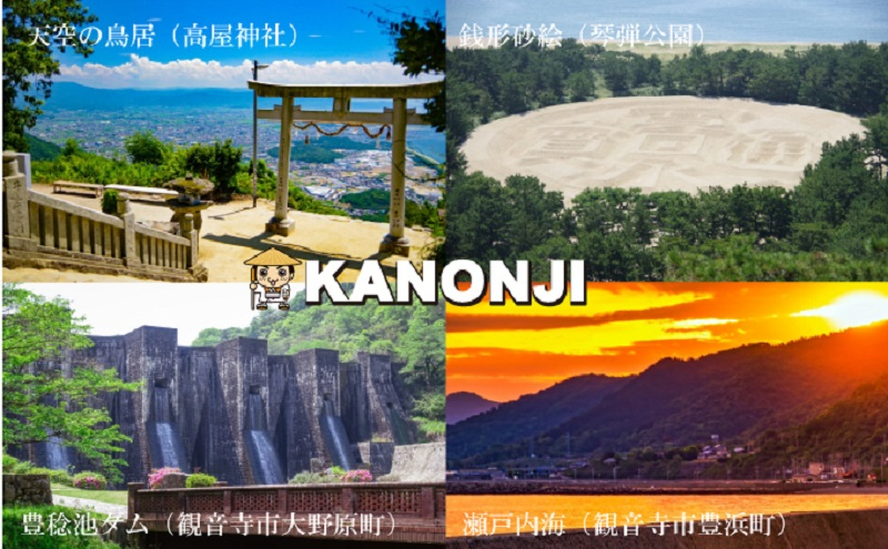名勝「琴弾公園」の有明浜は、「日本の渚百選」及び「日本の夕日百選」に認定されており、本市のシンボルとも言える銭形砂絵「寛永通宝」が描かれています。1633年に藩主の生駒高俊公を迎えるために一夜にして作られたと伝えられているこの巨大な砂絵は、東西122m、南北90m、周囲345mもあり、これを見れば健康で長生きし、お金に不自由しないといわれています。