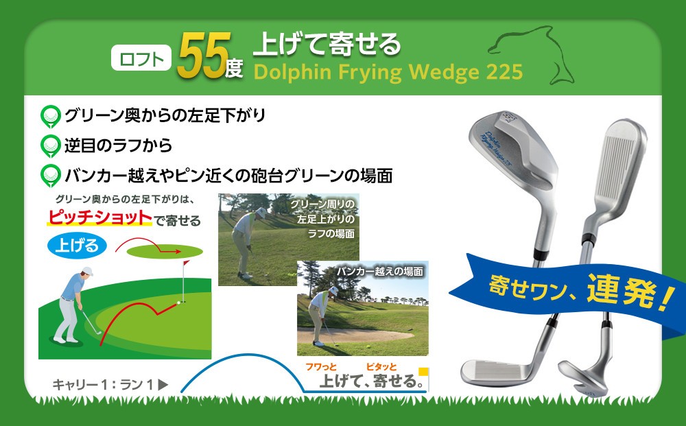 DW-225シリーズは、グリーン周りの3大ミス「ザックリ」「トップ」「シャンク」を克服して、20ヤード以内のアプローチを寄せワンできるウェッジ。