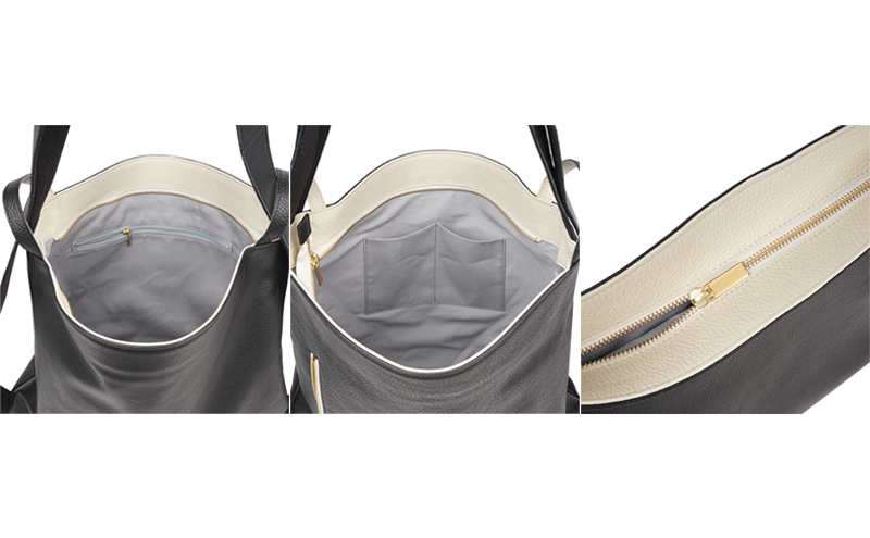 | 容量 | サイズ:H34×W34×D9cm 素材:イタリアンレザー、コットン 原産地:日本(香川県東かがわ市) カラー:Black、Ivory ■仕様 ・背面ファスナーポケット×1 ・内装オープンポケット×2 ・内装ファスナーポケット×1 ・フラワーチャーム/500円玉キーホルダー付き |