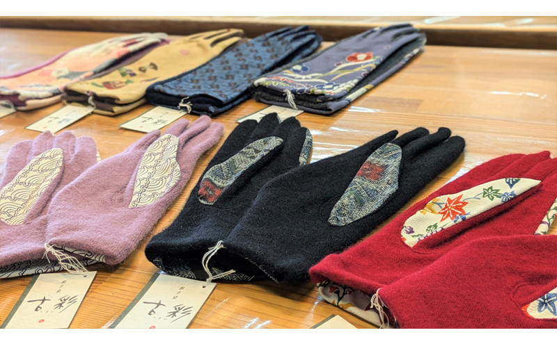 和装に合う手袋を求めるお客様の声から誕生した「和手袋・古彩」は着物生地を使用しているため、日本らしい絵柄が特徴。