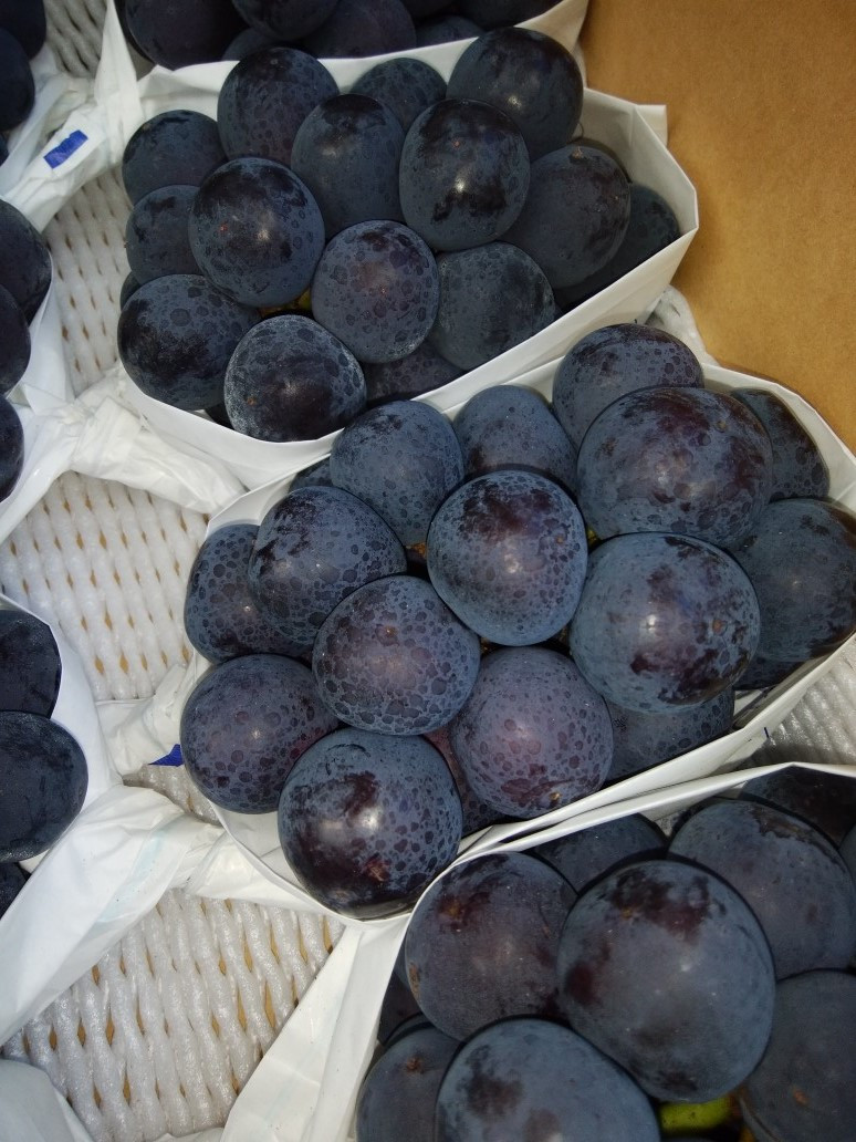 ピオーネは、巨峰とマスカットオブアレキサンドリアを交配したもので、紫黒色の顆粒が特徴です。