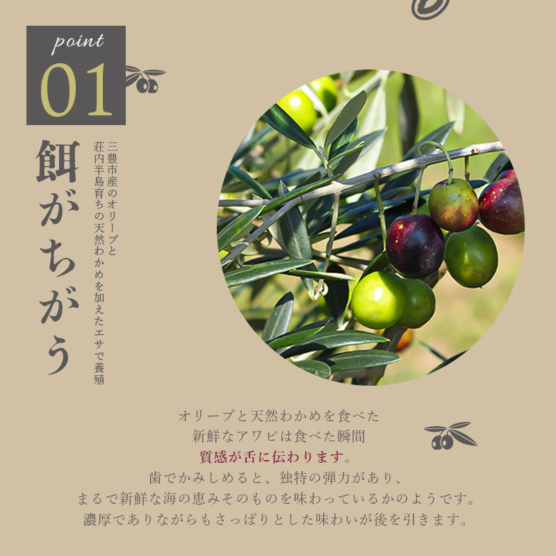 三豊市はオリーブの栽培も盛んですが、そのオリーブの葉をすりつぶして粉末にし餌として使用しています。オリーブ特有の「オレイン酸」が旨味をアップ!あわびのステーキ、酒蒸し、バター焼きなど、思う存分味わっていただけます。